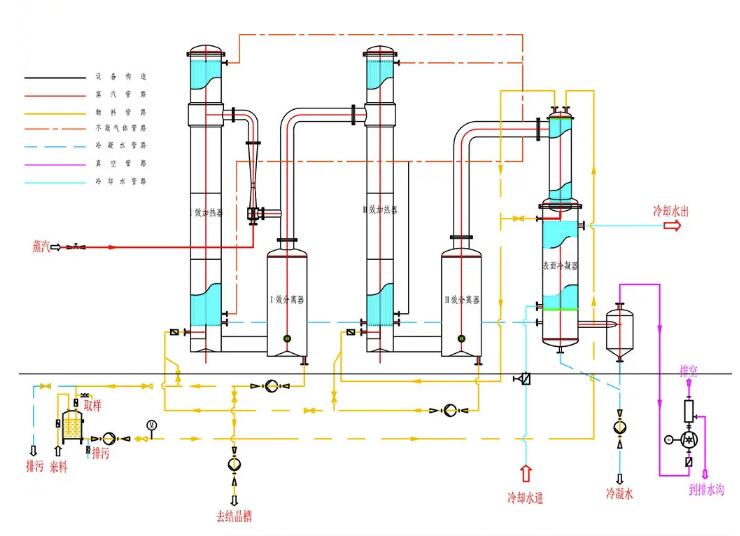 雙效(xiào)蒸發器的組成:加熱蒸發器、分離器、冷凝器、循環泵、保溫管、真(zhēn)空係統、料液輸送泵、冷凝排水泵、操作平台(tái)、電器儀(yí)表控製(zhì)櫃(guì)及閥門(mén)、管路(lù)等係(xì)統組(zǔ)成。