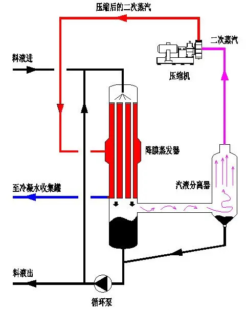 1)、料液從蒸發器的頂部(bù)加入,在重力作用下沿管壁呈膜狀流下,並在此過程中溶劑不斷地被蒸發而使溶質濃度(dù)提高,在換熱器底部得到其完成液。二次蒸汽進入MVR壓(yā)縮機, 經壓縮機(jī)壓縮後壓力上升,溫度上升,作為新的熱源加熱需要被蒸發的物料。
